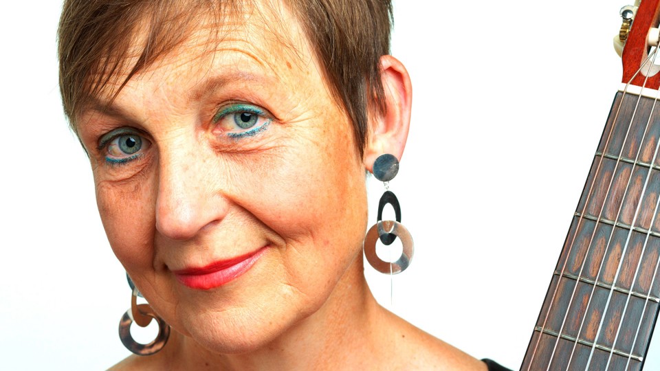 Helena har med sig allsångshäften och leder sången till eget gitarrackompanjemang.